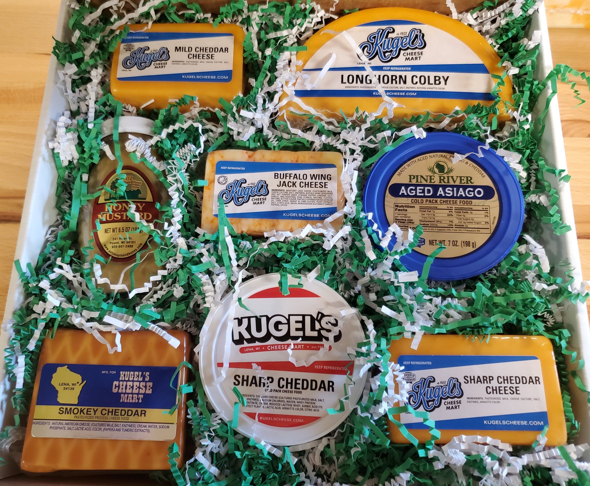 Gift Box containing the following items: 1# Colby Longhorn half-moon, 8oz Pete'sMustard, 7oz Black Creek Natural Smoked Sharp Cheddar Cheese, 8oz Sharp Cheddar Cheese Cold Pack, 7oz Pine River Asiago Cheese Cold Pack. 8oz Mild Cheddar Cheese, 8oz Buffalo Wing Jack Cheese, 8oz Sharp Cheddar Cheese.
